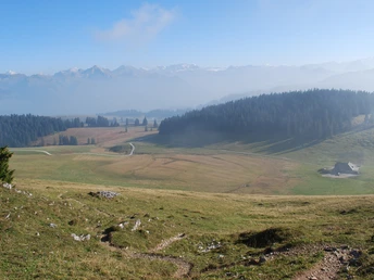 Depuis le sommet du col, la suite du chemin descendait autrefois raide par la gorge escarpée de Spitzenegg vers le Jäunli. Aujourd'hui, on reste sur le sommet offrant une belle vue. Une route alpine fait un grand détour autour du Zügweg équipé de remontées mécaniques, vers le marécageux Bädermoos, où elle se divise et tourne vers l'ouest autour de la Bäderegg. En montant toujours en douceur, la petite route tourne maintenant vers le nord dans la cuvette de tourbière du Bäderberg, au-dessus de laquelle s'élèvent les falaises du Bäderhorn. Ensuite, on se dirige directement vers la crête clairsemée boisée et atteint à la bifurcation de l'ascension du Bäderhorn (point 1744) le point culminant de la randonnée. La vue sur les montagnes de la vallée de Jaun et sur Jaun, situé 700 m plus bas, est splendide. Les bosses rondes et verdoyantes au-dessus de la vallée d'Abländschen contrastent magnifiquement avec les dents acérées de la chaîne de Gastlosen. La descente demande un peu d'attention. Le chemin descend d'abord tranquillement par le versant nord du Bäderhorn. Après avoir traversé une zone glissante, on descend très raide le long de celle-ci vers l'Ober Obfängli. Ensuite, un chemin carrossable en zigzag descend avec quelques montées jusqu'à la petite route à Leimera, où le chemin historique du col venant de Chlus (parcours 30a) rejoint. Comme un chemin panoramique, la petite route descend en nombreux virages vers Grabenweidli. Dans le virage étroit sur le chemin forestier vers la vallée, il faut rester sur place, puis descendre toujours près du Oberbach jusqu'à Kappelboden à la route du col, et sur un sentier parfois en contrebas jusqu'au centre du village de Jaun, dont la désignation française, Bellegarde, fait référence à une tour de guet.