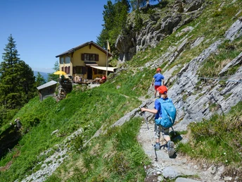 Vom Hotel Rosenlaui geht es kurz aufwärts zum Eingang der Gletscherschlucht. Nach Durchquerung der Schlucht (oder alternativ rechts daran vorbei) geht es kurz nach dem Ausgang über eine Brücke, welche sanft ansteigend (kurz bevor der Wanderweg in den Wald führt) zu einer Art kleinen Ebene, ein schöner Fleck für ein Picknick. Durch den Wald bergauf gewinnt man schnell an Höhe, wobei sich derBlick auf den zerrissenen und eindrücklichen Rosenlauigletscher autftut. Bei der Wegkreuzung P.1683 zweigt der weiss-blau-weiss markierte Alpinwanderweg zur Dossenhütte nach rechts ab. Wir gehen links auf schmalem Wege weiter. Dieser führt nun über glatte und abschüssige Felsen, hier ist Trittsicherheit gefragt. In einem weiten Rechtsbogen geht es um den Rosenlauistock herum und unter dem Ausläufer des Ochsentals weiter hinüber zur heimeligen und hübsch gelegenen Engelhornhütte. Von der Hütte führt ein Pfad hinab zum Graagistein und dann auf einer Alpstrasse zu den Alphütten Gross-Rychenbach. Auf einer Strasse geht es abwärts bis zur Brücke bei Gschwantenmad. Vor der Brücke halten wir uns links und erreichen so das Hotel Rosenlaui.