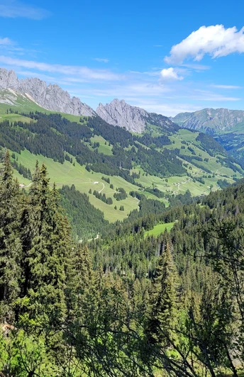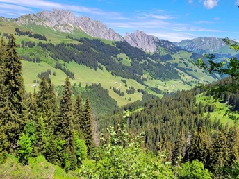 Le départ se fait à la gare de Saanenmöser. Nous traversons la route nationale et nous dirigeons vers le nord en direction du ravin Simne. Nous laissons de côté le premier panneau indiquant Abländschen à droite, continuons le long de la route ascendante, admirant les chalets chics des riches jusqu'à la prairie de montagne, où le chemin tourne à droite en direction de Simne et Abländschen. Il apparaît bientôt sur la carte - le toponyme "Âne". Mais aucun animal gris à l'horizon, seulement beaucoup de nature et une belle aire de grillades. La randonnée suit désormais un sentier naturel le long de la Kleine Simme, qui prend sa source au Schneitgrat et s'écoule parfois sauvage, parfois domptée vers la vallée. Au point 1442, le chemin tourne à droite vers Abländschen. Le sentier devient plus pentu, traverse au printemps des prairies fleuries jusqu'à Bire, avec le Saanenland dans le dos et plus loin le Wildhorn encore enneigé. Le seul défaut dans ce beau paysage est une ligne haute tension qui perturbe la vue. Peu après, magnifique panorama au point le plus élevé de la randonnée, Bire, à la suite du Hundsrügg. De là, la descente commence et bientôt apparaissent les pointes sauvages des Gastlosen et la vallée verte d'Abländschen. Le chemin de montagne se rétrécit et serpente à travers une forêt féerique pleine de fougères et de mousses jusqu'au fond de la vallée, où le Jäunlibach a déposé beaucoup de pierres. La randonnée descend maintenant vers Abländschen, où vivent quelques familles paysannes et de nombreuses vaches dans cet endroit isolé appartenant à Saanen, désormais même desservi par un e-car postal. C'est aussi ici que se trouve l'hôtel de montagne « Zur Sau », reconnu dans le guide gastronomique Gault Millau pour ses excellentes Côtes de Cochon et pommes de terre rôties. Autrefois, il y avait une "petite remontée" dans la vallée, expliquent les hôteliers, donnant leur nom spécial à l'établissement. Dans la maison rénovée, tu peux finir la randonnée de manière raffinée ou simplement « abländern », comme disent les habitants.