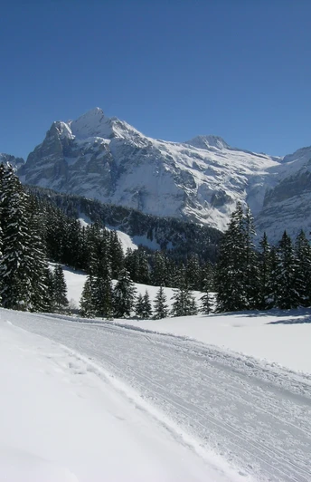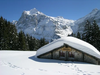 Depuis l’eldorado de la luge de Bussalp, on descend vers Holzmattenläger en suivant le sentier de randonnée hivernale préparé parallèlement à la route. Là, le parcours quitte la route et suit désormais le « sentier en altitude 1600 ». D'abord entièrement sur des pâturages ouverts, puis en partie à travers des zones boisées, le chemin longe la pente avec de légères montées et descentes jusqu'à Späten Boden. Avec une vue magnifique sur le monde glaciaire entre l'Eiger et le Schreckhorn, la route continue à travers les pâturages enneigés vers Rasthysi en contrebas. Le nom évoque une invitation claire : la cabane accueillante offre l'occasion d'une pause avec nourriture et boisson. Après une courte montée, on traverse une zone de coulées d'avalanches notoires dans la région de Bären. En cas de danger d'avalanches, le sentier en terrain ouvert est fermé sur environ 100 mètres et passe par une galerie spécialement aménagée pour les piétons.