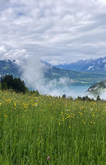 Prends la télécabine après la randonnée jusqu'au Niederhorn et admire le spectaculaire coucher de soleil au sommet de la montagne. Après le dîner, tu peux passer la nuit à l'auberge de montagne ou redescendre avec la dernière télécabine.