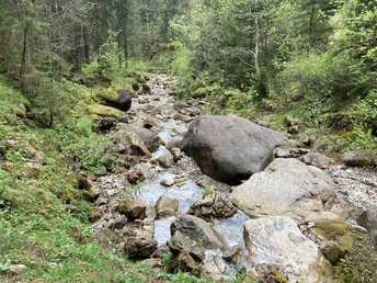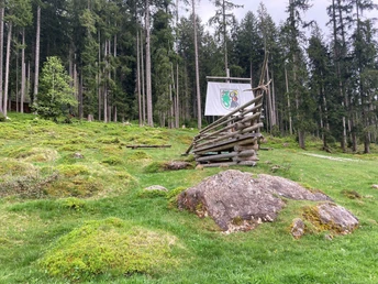 En début de soirée, les randonneurs attentifs ont la possibilité d'observer des chevreuils et d'autres animaux dans les prairies proches de la forêt. De chaque côté du chemin, on peut voir des passages de gibier. Au point 1352, le parcours quitte le chemin de gravier pour un sentier étroit et racineux qui descend à travers la forêt jusqu'à un pâturage offrant la plus belle vue sur le lac de Thoune et les sommets alpins. Le klaxon des bateaux de promenade est parfois audible jusqu'ici. En fin d'été, les ombres du soleil couchant dessinent plus ou moins distinctement une croix suisse sur le versant nord blanc de la Jungfrau, visible d'ici. Plus bas, à Rossi, une petite ferme au bord de la route propose du fromage et des gourmandises faites maison. Les derniers quelques centaines de mètres suivent la rue du village jusqu'à la station de car postal près du bâtiment de la télécabine. Ceux qui le souhaitent peuvent s'approvisionner en lecture dans la boîte à livres publique près de la maison de retraite. Afin de ne pas déranger inutilement la faune sauvage, la randonnée devrait impérativement être effectuée avant la tombée de la nuit, afin qu'aucune source lumineuse ne soit nécessaire.