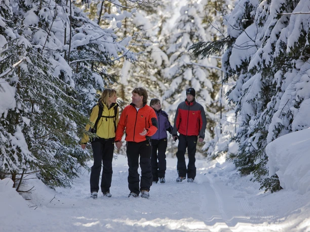 Le véritable site Uf der Höh n’est pas accessible en hiver. En suivant le sentier balisé de randonnée hivernale, on se réfère aux panneaux roses qui mènent au site Höh. De là, la courte excursion à la Risetenegg vaut la peine – ce n’est pas un point de vue classique, car la vue est limitée des deux côtés par la dense forêt de conifères. Mais vers l’est et le sud, la vue sur Kandersteg et les sommets environnants est d’autant plus attrayante. En traversant la forêt et en longeant sa lisière, on descend par des chemins forestiers tranquilles jusqu’aux maisons de Bütschels. Là, on tourne à gauche en direction de la ligne de chemin de fer et on la suit jusqu’à la gare de Kandersteg, accessible par le passage souterrain prolongé du quai.