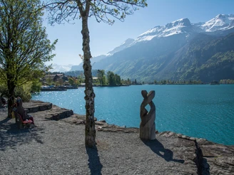 Au premier carrefour de Hofstetten, on suit la signalisation Brienz vers la gauche à travers le petit village. Peu après avoir quitté Brienz, un chemin bifurque à droite, longeant des prairies avec une belle vue sur le lac de Brienz, et atteint bientôt Schwanden près de Brienz. Le chemin mène directement au bord du lac à l’entrée de Brienz. En longeant la magnifique promenade au bord de l’eau, il reste environ 10 minutes jusqu’à la gare de Brienz.