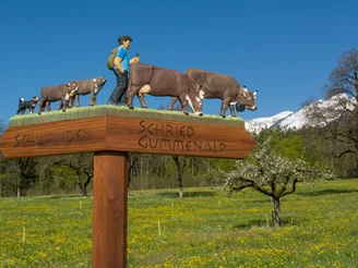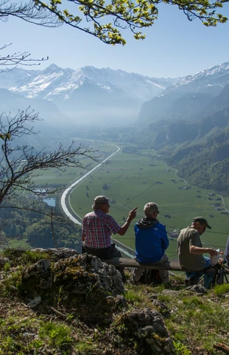 Depuis la gare du col de Brünig, on suit la route du col, en passant devant le restaurant Kulm, jusqu’à ce qu’un panneau nous indique sur la droite le chemin en direction de Brienzwiler / Brienz (environ 15 minutes). Jusqu’à la cabane alpine Brääch, on suit une route d’alpage puis un sentier de randonnée en légère montée dans la forêt d’Uoch. On ne doit pas manquer la bifurcation indiquée vers le point de vue Tschuggen, car cette petite incursion (environ 15 minutes aller-retour) en vaut la peine ; une vue magnifique sur le lac de Brienz et toute la vallée de Hasli s’offre à nous. De retour à la bifurcation, on descend ensuite dans la forêt jusqu’au pont où il faut tourner à gauche et descendre vers Brienzwiler. À travers le village, on suit la signalisation en direction de Brienz. Après Bifing, on se tient à droite pour rester sur le côté droit de la petite plaine traversée par le Fulbach. De l’autre côté (au sud) se trouve l’enceinte et l’entrée ouest du musée en plein air Ballenberg.