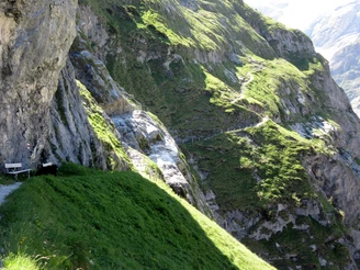 Le sentier serpente tranquillement de Pfingstegg à travers des prairies ouvertes et à travers la forêt de conifères vers le glacier. Dès qu'on quitte la forêt, la montée raide vers la cabane commence. En arrière-plan, on peut voir les sommets enneigés du Fiescherhörner. La piste devient plus étroite et s'enroule courbe par courbe. Dans la vallée, à droite, se trouvent les vestiges du glacier inférieur de Grindelwald. Si vous regardez de près, vous pouvez voir des morceaux de glace et le lac glaciaire.